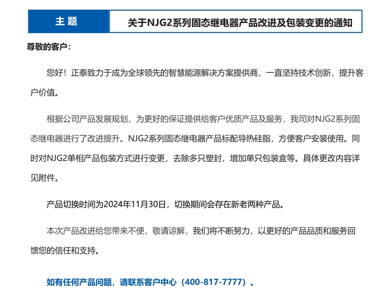 關(guān)于NJG2系列固態(tài)繼電器產(chǎn)品改進及包裝變更的通知
