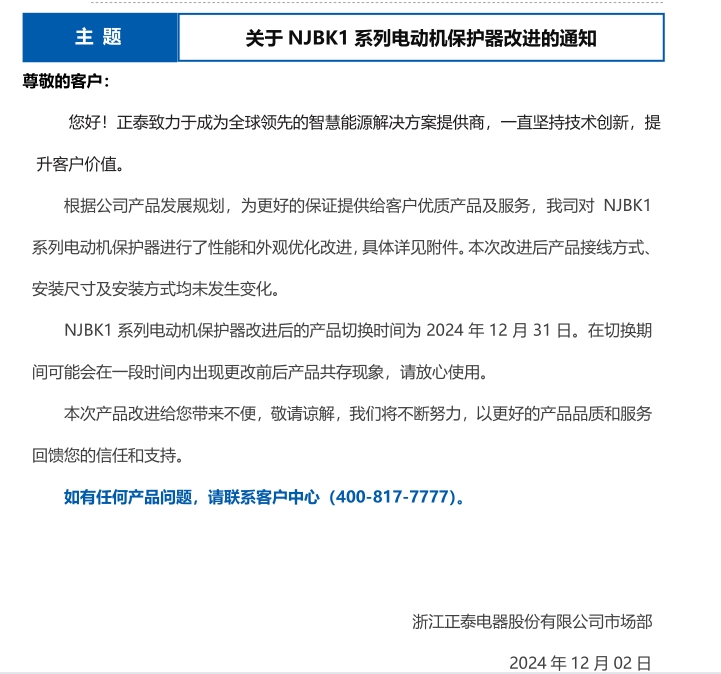 關(guān)于 NJBK1 系列電動機保護器改進的通知