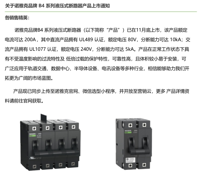 關于諾雅克品牌 B4 系列液壓式斷路器產(chǎn)品上市通知