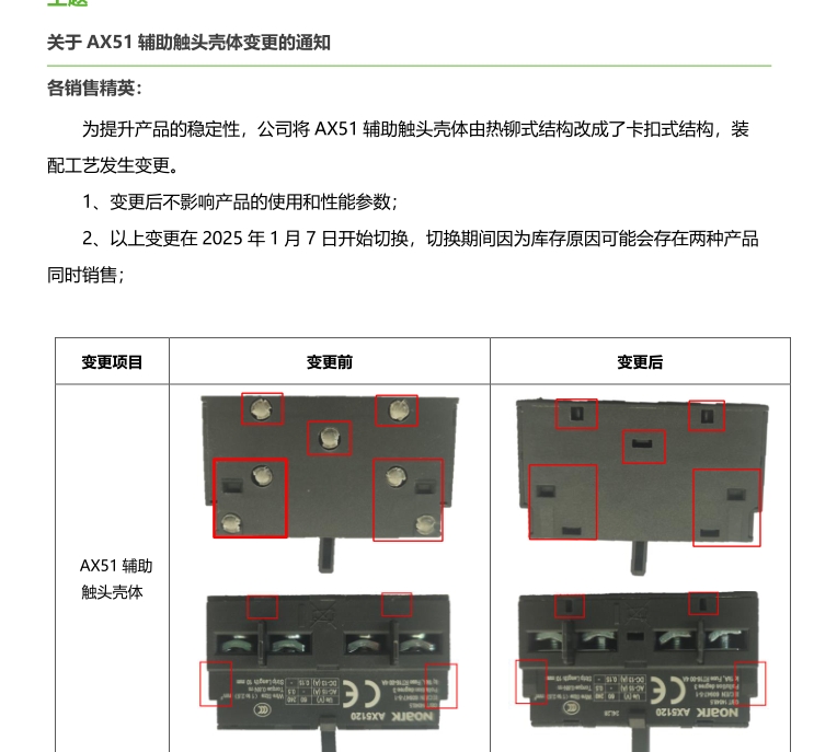 關(guān)于 AX51 輔助觸頭殼體變更的通知