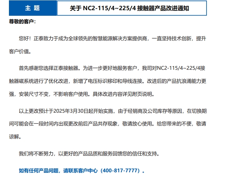 關于 NC2-115/4~225/4 接觸器產(chǎn)品改進通知
